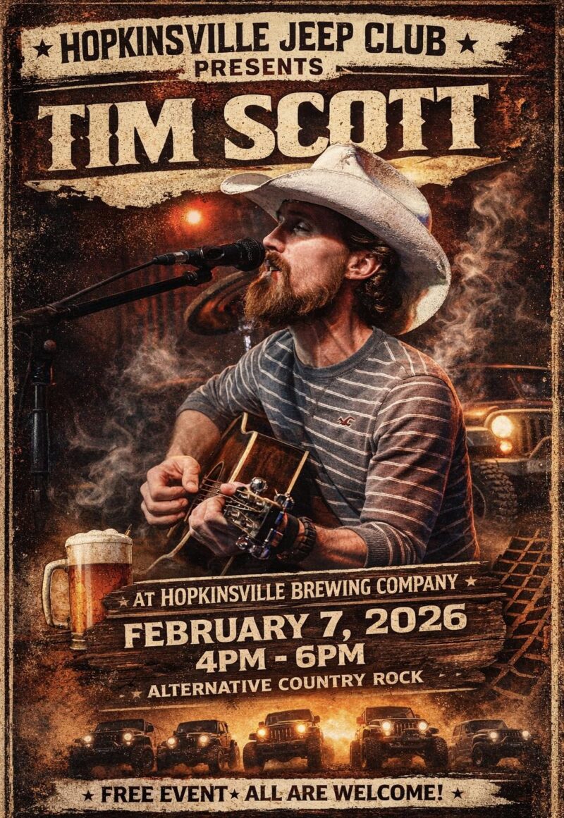Hopkinsville Jeep Club is proud to present Tim Scott LIVE at Hopkinsville Brewing Company! Hopkinsville Brewing Company Saturday, February 7, 2026 4 PM – 6 PM Alternative Country Rock FREE…