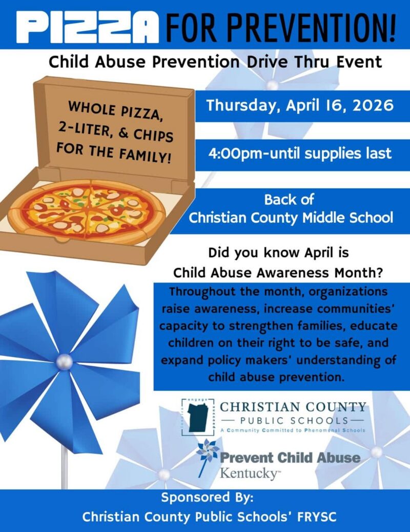 Join us this Thursday for our Pizza for Prevention event!Thursday, April 164:00 PM until supplies lastBack of Christian County Middle SchoolApril is Child Abuse Prevention Month, and this event is…