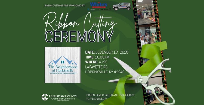 The Neighborhood at Hopkinsville 4190 Lafayette Road, Hopkinsville, KY, United StatesJoin the Chamber of Commerce as we celebrate The Neighborhood at Hopkinsville with a Ribbon Cutting. We are grateful to have such a caring senior living community in Hopkinsville and excited for all the wonderful things ahead! Thank you to White's Auto Mall for sponsoring our Ribbon Cuttings, and Ruffled Willow for providing our ribbon.