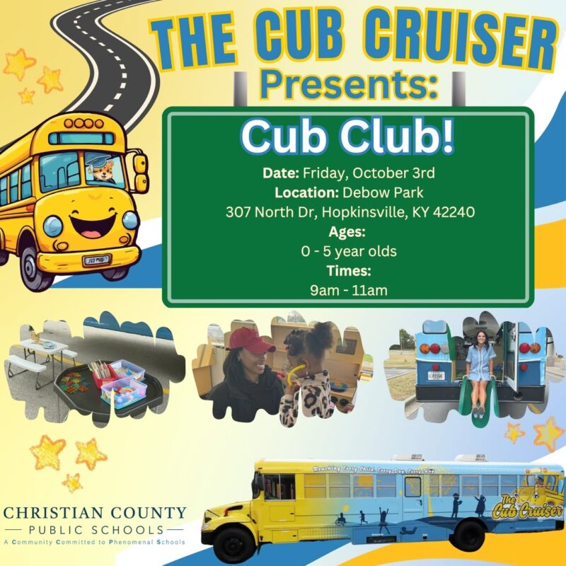 The Cub Cruiser is rolling out FRIDAY, Oct. 3! Bring your littles for a fun-filled morning at CUB CLUB Debow Park 9–11 AM Ages Birth–5Parents, you’ll also pick up awesome tips & strategies to model for your littles while they play & learn! Come join the fun, we can’t wait to see our Cub Club…