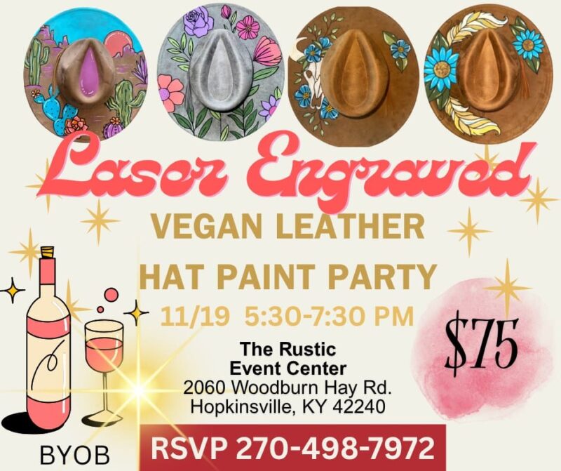 We are excited to invite you to our 2nd Laser Engraved Hat Paint Party. During this event, participants will have the opportunity to work on a vegan leather hat that is already laser engraved. Hats are available in 4 colors (Mocha, Gray, Khaki and Camel). The hats feature an adjustable ribbon and they fit 20-24.5"…