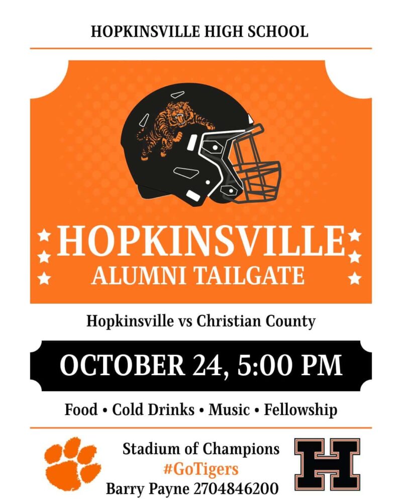 Stadium of Champions 9503 Eagle Way Bypass, Hopkinsville, KY, United StatesHHS ALUMNI TAILGATE Hopkinsville Alumni, it’s time to come together one last time before HISTORY is made! Join us for the HHS Alumni Tailgate on Friday, October 24th at 5:00 PM inside the Stadium of Champions (away side fenced in section behind the endzone) before the FINAL Hopkinsville vs Christian County Football Game. Bring your…