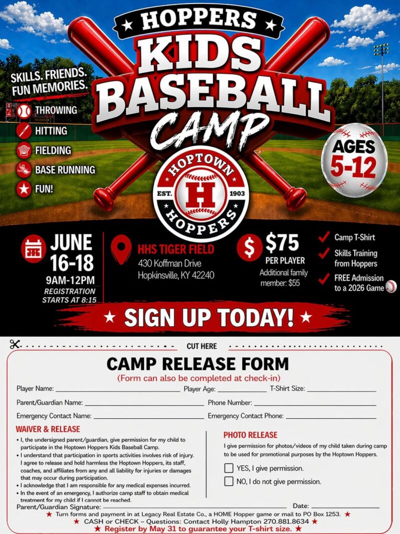 CAMP REGISTRATION IS OPEN! June 16, 17, 18Get ready for 3 days of fun, skill-building, and unforgettable summer memories! Camp T-Shirt Included Home Game Ticket Instruction from Collegiate Baseball Players Fun, Energy & Team Spirit! Huge shoutout to Hopkinsville Water Environment Authority for bringing the Water Monster each day to keep everyone cool!