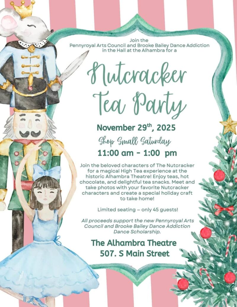 Alhambra Theatre 507 S. Main St., Hopkinsville, KY, United StatesNutcracker Tea Party We are so excited! Come join us for a magical day during Shop Small Saturday 11am-1pm-Alhambra Theatre.Join the beloved characters of The Nutcracker for a magical High Tea experience. Enjoy teas, hot chocolate, and delightful tea snacks. Meet and take photos with your favorite Nutcracker characters and create a special holiday craft…