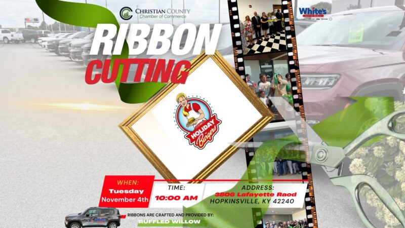 Holiday Burgers 3806 Lafayette Rd, Hopkinsville, United StatesOne of your favorite local restaurants has undergone a little facelift. Join us as we celebrate their "new look" with a ribbon cutting on November 4th at 10am. Still serving the same great menu, you know and love!Thank you to White's Auto Mall for sponsoring our Ribbon Cuttings, and Ruffled Willow for providing our ribbon.