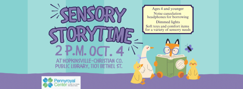 Hopkinsville Christian County Public Library 1101 Bethel Street, Hopkinsville, KY, United StatesSensory Storytime is a special time for our friends who prefer a quieter setting. Sensory Storytime is scheduled for 2-3 p.m. Oct. 4 at Hopkinsville-Christian Co. Public Library, 1101 Bethel St.This program is for children ages 4 and younger. Noise cancellation headphones will be available for borrowing during the storytime. We will have the lights…