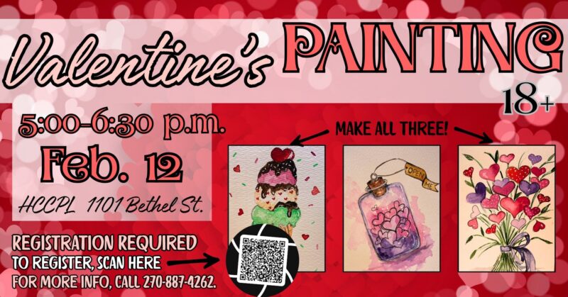 Use watercolor paints to make your own Valentine’s Day cards. Light refreshments will be provided. For ages 18 and older. Registration required.To register: https://forms.gle/K4HgDdjcqQwFJp4o7
