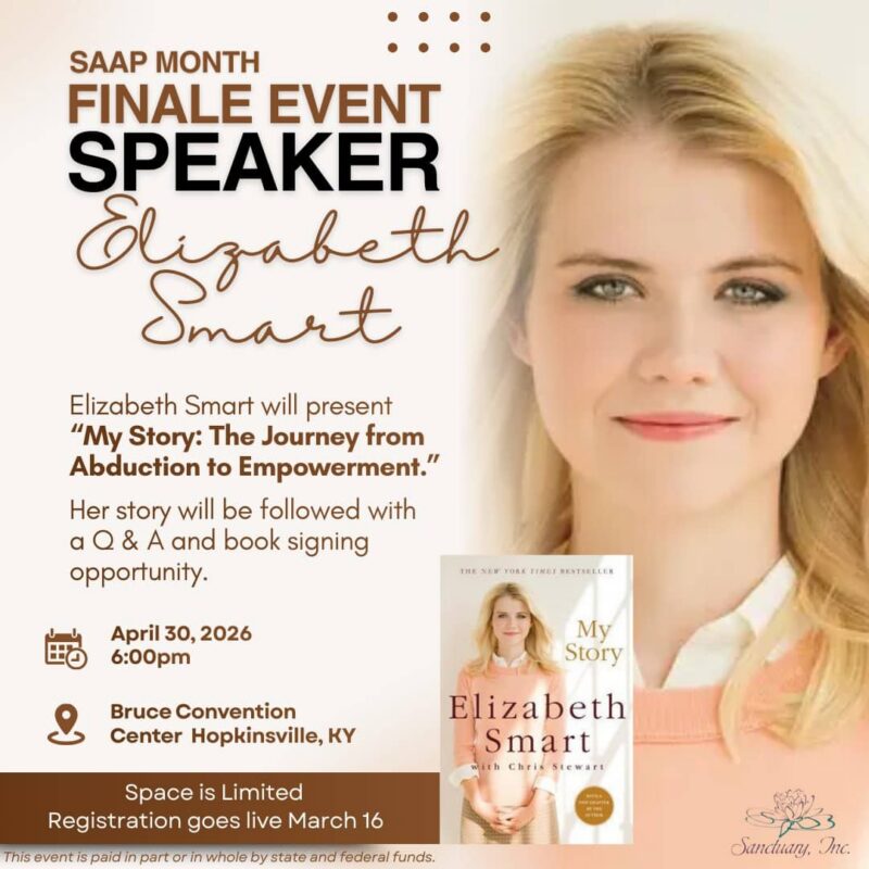 Join us for Sexual Assault Awareness and Prevention Month events and activities across the Pennyrile, including our finale event featuring keynote speaker, Elizabeth Smart. Join us on April 30 at The Bruce Convention Center in Hopkinsville as Elizabeth Smart shares “My Story: The Journey from Abduction to Empowerment.” Her powerful message of resilience, healing, and…