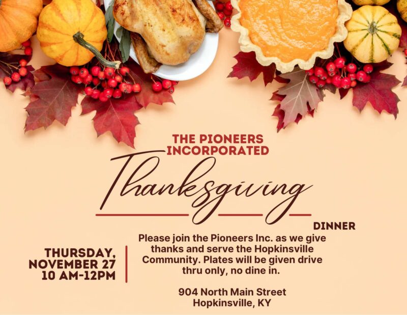 Please join the Pioneers Inc. as we give thanks and serve the Hopkinsville Community. Plates will be given drive thru only, no dine in.