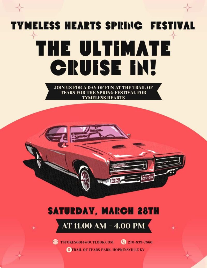 Join us for a day of fun at the Trail of Tears for the Spring Festival for Tymeless Hearts.tstokes0014@outlook.com or 270-839-7860